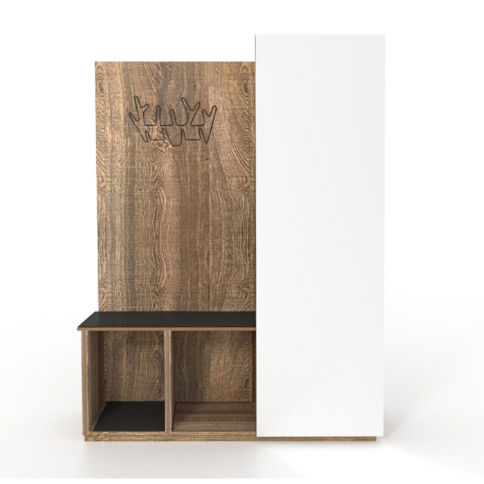 Garderob i fanér med linoleumskiva spegel till höger