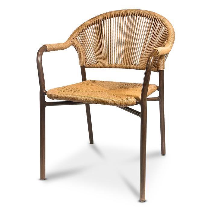 Nätt karmstol med rundat ryggstöd för optimal komfort. Stolen är tillverkad med en Ø 25 mm brunlackerad aluminiumstomme för låg vikt och enkel hantering. Sits och ryggstöd är klädda i slitstark fiberrotting med en textur som påminner om rep för ett naturligt och rustikt intryck.